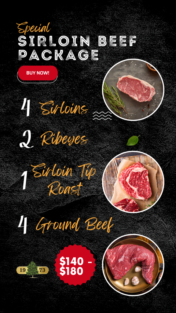 Thinking about sirloins for dinner this week? Simplify your meal planning with our Sirloin Beef Package. Stop by the Ranch for the best selection!