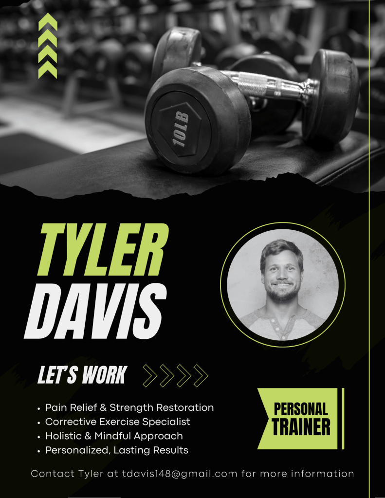 With more than a decade of experience as a personal trainer, Tyler helps his clients move beyond pain and back into strength. He specialize in corrective exercise that restores function, improves mobility, and builds lasting resilience. His approach blends proven, science-based methods with a holistic understanding of how the body and mind work together.