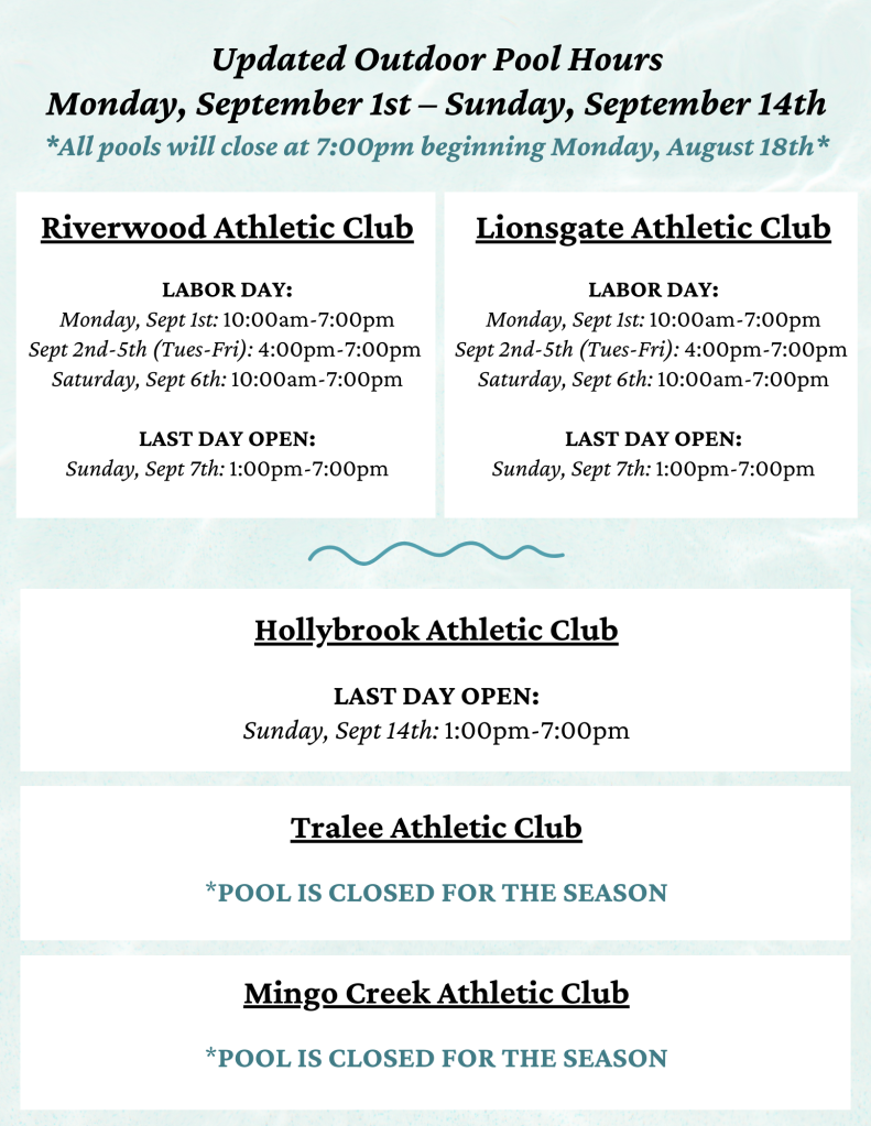 Last splash of the season! Be sure to check out the updated pool hours for Tralee, Lionsgate, Hollybrook, Riverwood, and Mingo Creek. Remember, all pools close at 7 PM starting August 18th. And don’t forget to use your guest passes before it’s too late!