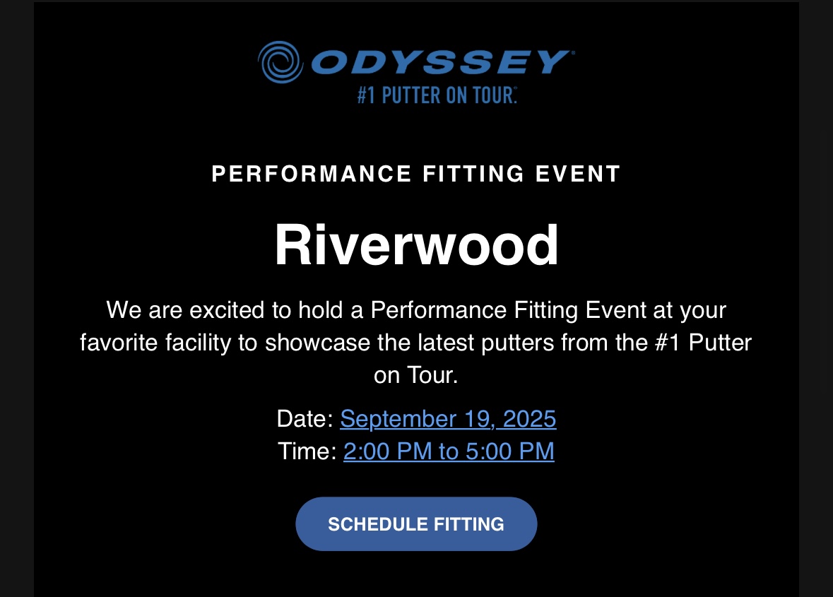 Callaway will be holding an exclusive, member-only performance fitting at Riverwood Golf Club on Friday, September 19 from 2:00pm-5:00pm. All fittings are by scheduled appointment only. To sign up for your personal Callaway fitting, please use the link below.