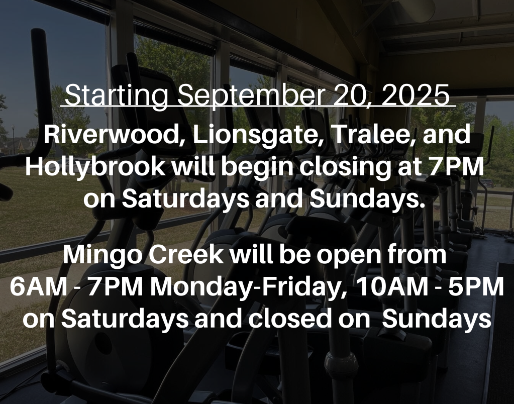 Starting September 20, Riverwood Athletic Club, Lionsgate Athletic Club, Tralee Athletic Club, and Hollybrook Athletic Club will begin closing at 7PM on Saturdays and Sundays. Mingo Creek Athletic Club will close at 5PM on Saturdays and will be CLOSED Sundays.