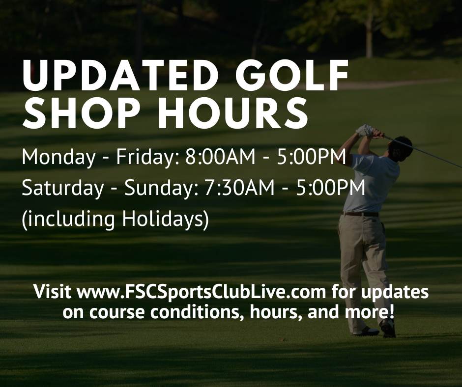 Updated Golf Shop Hours Home Featured Events Updated Golf Shop Hours Planning your next tee time? Check out our updated golf shop hours! Remember to visit www.FSCSportsClubLive.com for the latest course conditions.