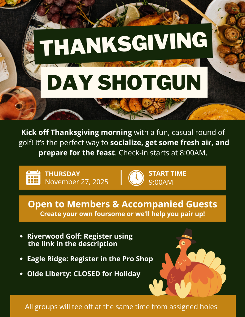 Join us for the Thanksgiving Day Shotgun! A casual, fun round of golf starting at 9:00 AM. It’s the perfect way to get moving and work up an appetite! Create your own foursome or we’ll help you pair up! Don’t miss out on this fun holiday tradition.