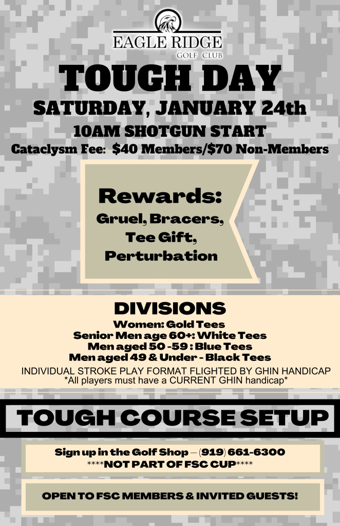 Are you up for the challenge? Join us for Tough Day at Eagle Ridge Golf Club, a special one-day event designed to test every part of your game. We’ll be setting the course up at it’s most demanding – challenging pin placements, firm conditions, and a true champion-style experience.