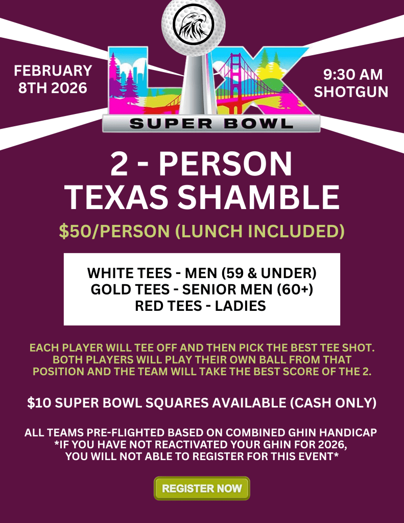 2026 Super Bowl Shamble Home Featured Events 2026 Super Bowl Shamble Kick off Super Bowl Sunday on the course! Our 2-Person Texas Shamble tees off February 8th at 9:30AM. Click the link here to sign up! https://www.golfgenius.com/ggid/ysgahx