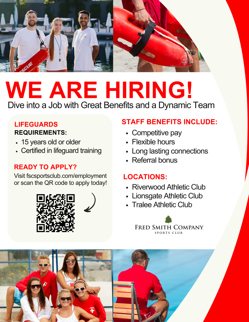 Now Hiring Lifeguards Home Featured Events Now Hiring Lifeguards FSC Sports Club is now hiring lifeguards to join our Riverwood, Lionsgate, and Tralee team until the end of the season! Click the link here to apply