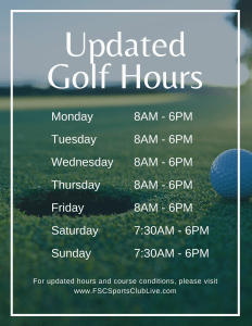 Planning your next tee time? Check out our updated golf hours! Remember to visit www.FSCSportsClubLive.com for the latest course conditions. … [Read more...] about Updated FSC Golf Hours